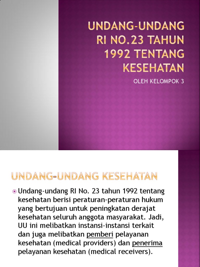 Pemahaman tentang kesehatan telah bergeser seiring dengan waktu. Berdasarkan undang undang ri no 23 tahun 1992 tentang kesehatan yang dimaksud dengan alat kesehatan adalah instrumen aparatus mesin implan yang tidak mengandung obat yang digunakan untuk mencegah mendiagnosis menyembuhkan dan meringankan penyakit merawat orang sakit serta memulihkan kesehatan pada manusia dan atau untuk membentuk struktur dan memperbaiki fungsi tubuh. Selain itu klien atau pasien sebagai pengguna jasa juga merupakan konsumen sehingga dalam hal ini berlaku juga ketentuan uu no. Badan ini adalah sebuah badan yang ditugaskan oleh undang undang untuk melaksanakan program penjaminan dan pemeliharaan kesehatan bagi seluruh rakyat indonesia.