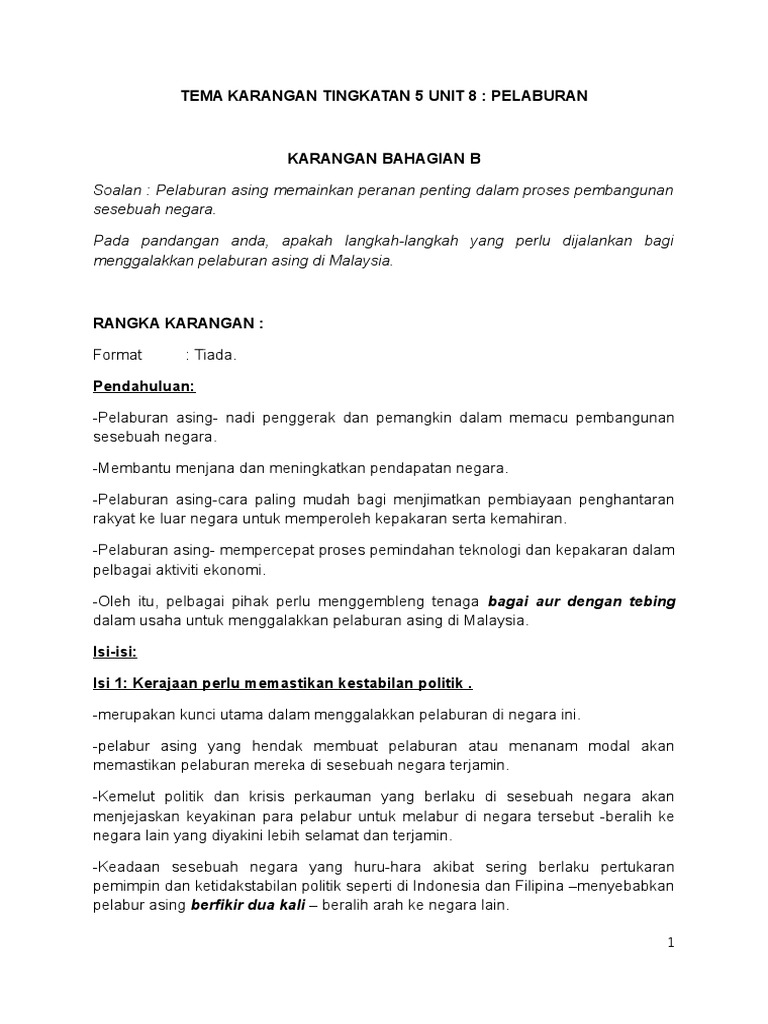 Ipendidikan karangan faktor faktor yang menggalakkan pelaburan asing di malaysia disemak dan dikemaskini pada pukul 7 26 am 8 mei 2020 tajuk yang berkaitan masyarakat dan negara selalu menjadi pilihan dalam soalan karangan bahasa melayu. Kerajaan menggubal dasar untuk memberi jaminan serta menggalakkan pelaburan asing.