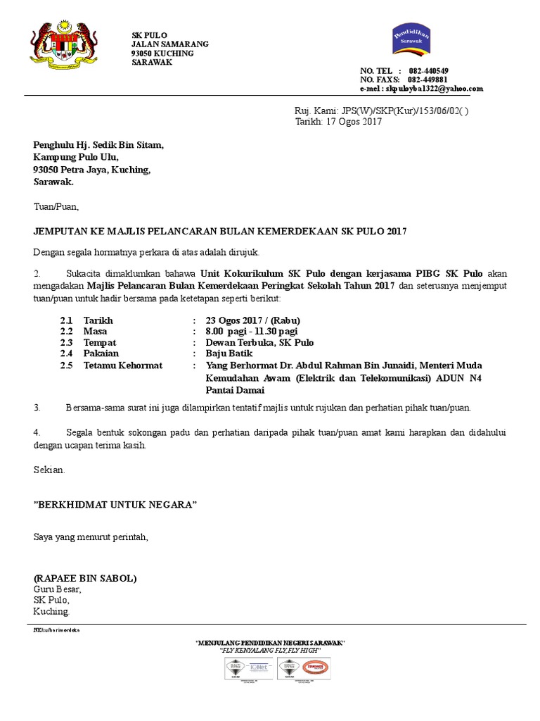 Contoh surat jemputan rasmi kepada vip contoh surat rasmi kepada kerajaan contoh surat rasmi kepada yang berhormat contoh surat rasmi kepada lhdn contoh surat rasmi kepada sultan contoh surat rasmi kepada cikgu contoh surat rasmi tidak hadir ke sekolah contoh surat rasmi kerajaan contoh surat rasmi rayuan contoh surat rasmi memohon. Terdapat pelbagai program yang dijalankan di sekolah dan antaranya ia melibatkan jemputan penceramah dari luar. Contoh surat jemput perasmian. Surat rasmi kepada ketua menteri surat tulisan qur an.