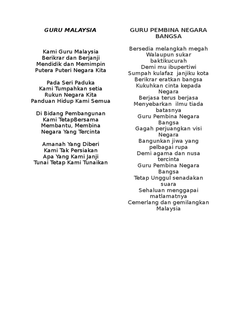 Guru pembina negara bangsa gagah perjuangkan visi negara bangunkan jiwa yang pelbagai rupa demi agama dan nusa tercinta guru pembina negara bangsa tetap unggul senadakan suara sehaluan menggapai matlamatnya cemerlang dan gemilangkan malaysia pencipta lagu. Lirik lagu guru malaysia dan guru pembina negara bangsa lagu guru malaysia kami guru malaysia berikrar dan berjanji mendidik dan memimpin putra putri negara kita. Guru pembina bangsa negara lirik lagu dan video. Khairulrizam bin khalid pencipta lirik.